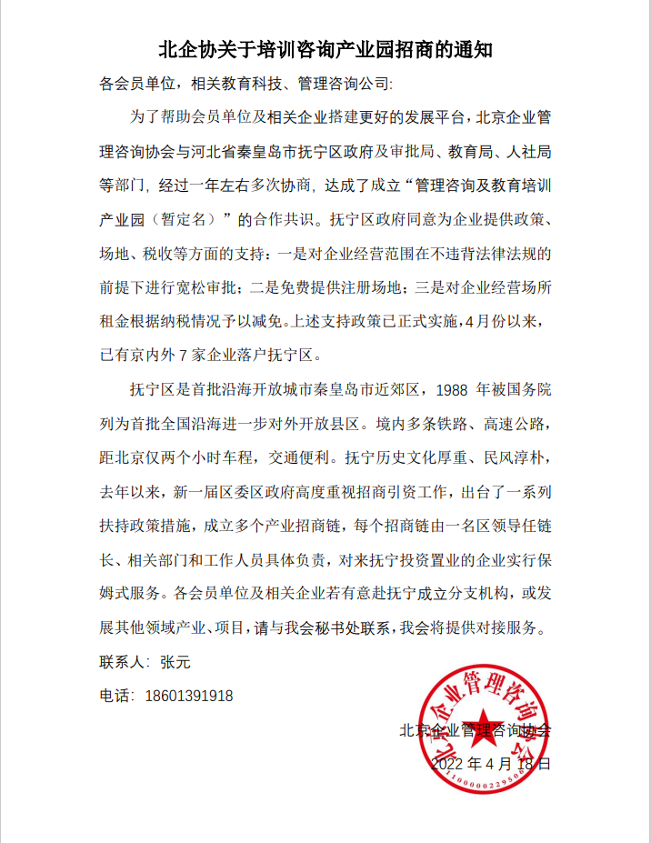 北企協(xié)關(guān)于培訓(xùn)咨詢產(chǎn)業(yè)園招商的通知